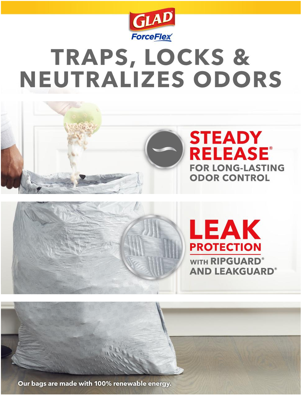 - FORCEFLEX TECHNOLOGY: Glad’s patented dual-layer protection is designed to give extra flex as it expands around sharp edges and heavy loads while resisting punctures, rips and tears