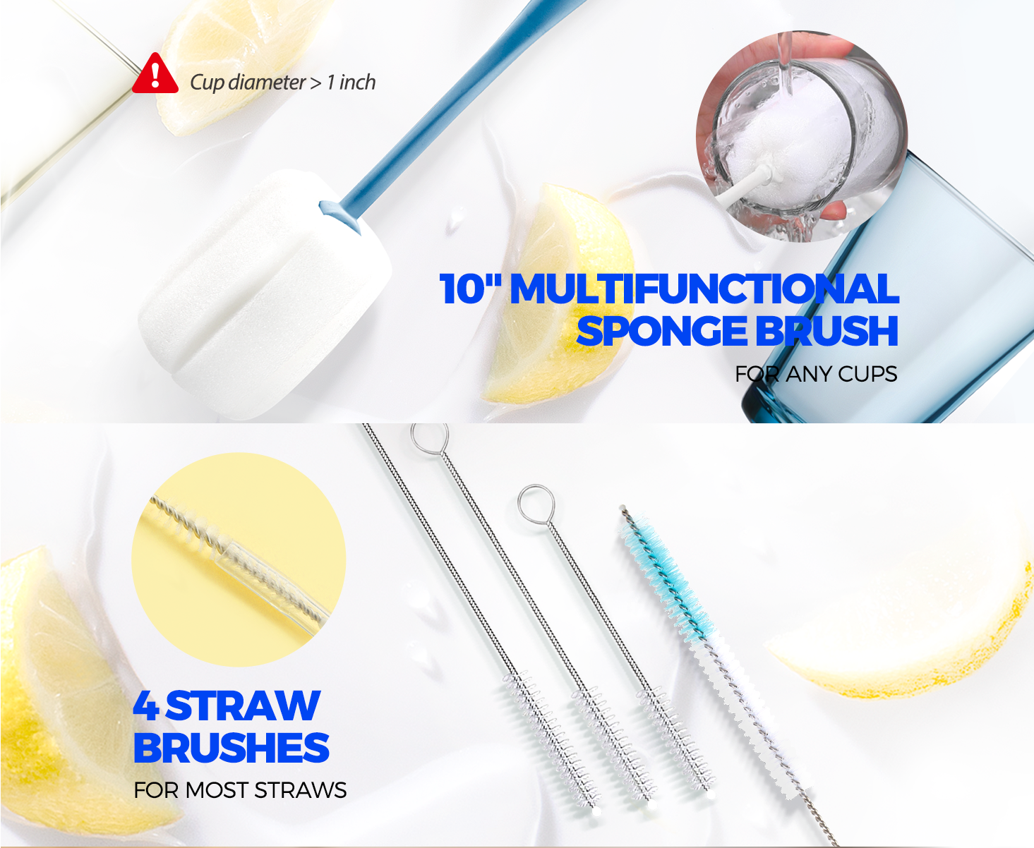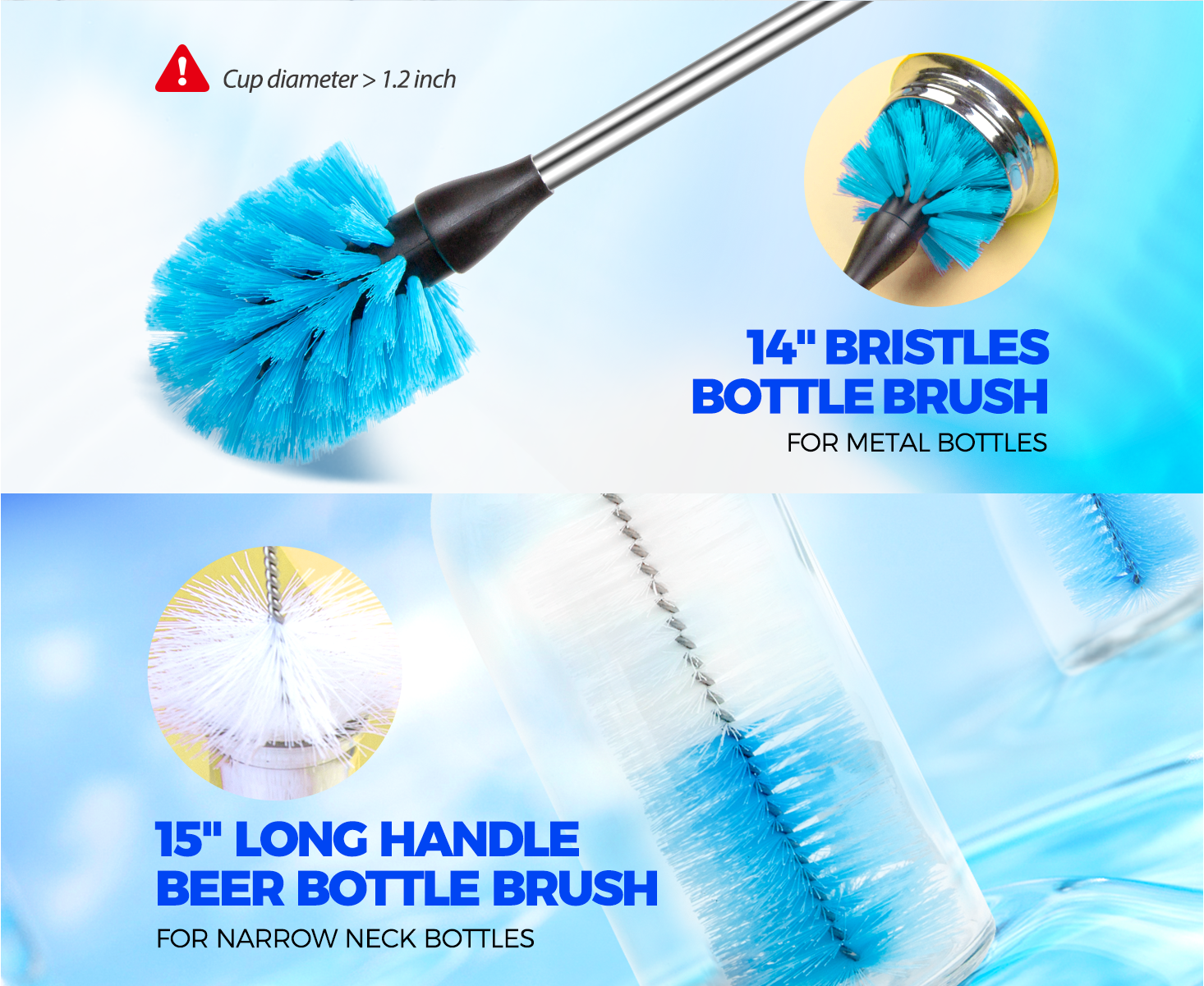 - 🔶8 Pack Bottle Cleaning Brushes, multiple uses, including 15" long handle beer bottle brush, 14" sports water bottle brush, 10" multifunction sponge brush, 4.3" spout cleaning brush, 7.9-12.5" straw brushes. You can hang them on hook for drying and storage.