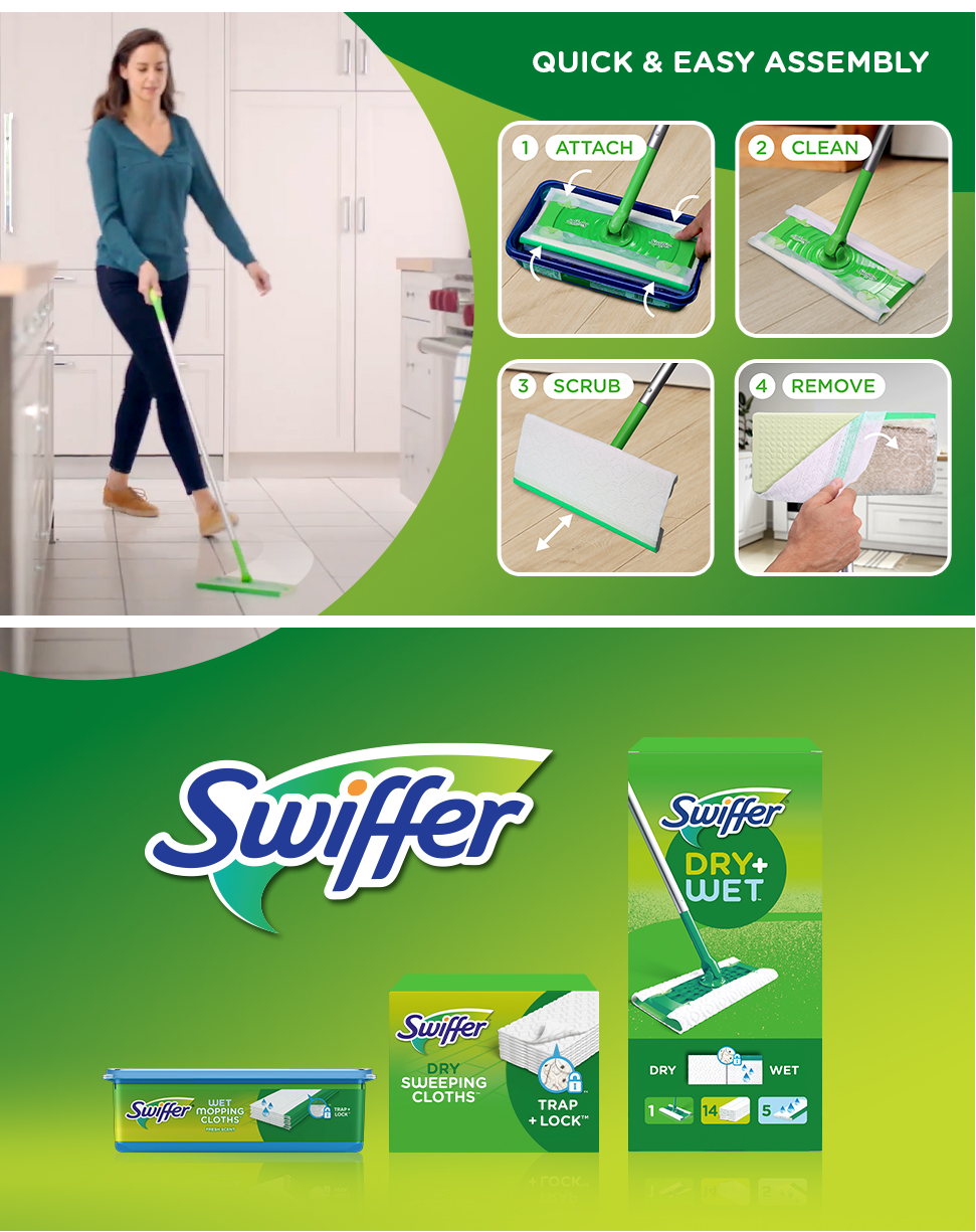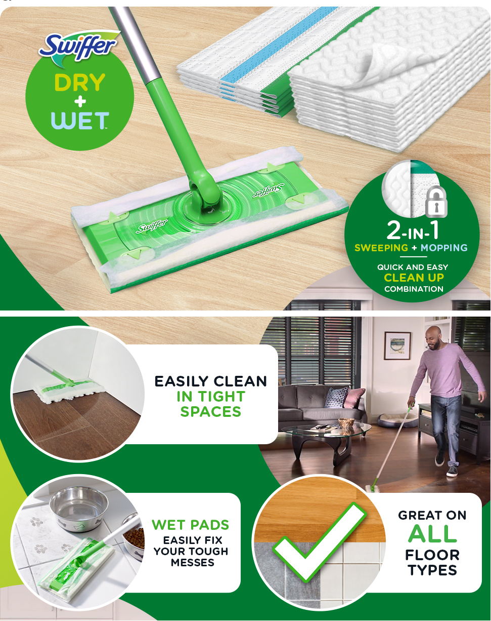 - Swiffer WetJet Spray Mop gives you the cleaning power of a mop with the convenience of a wipe; Easily get into tight spaces and clean your floors in minutes without the hassle of a mop and bucket