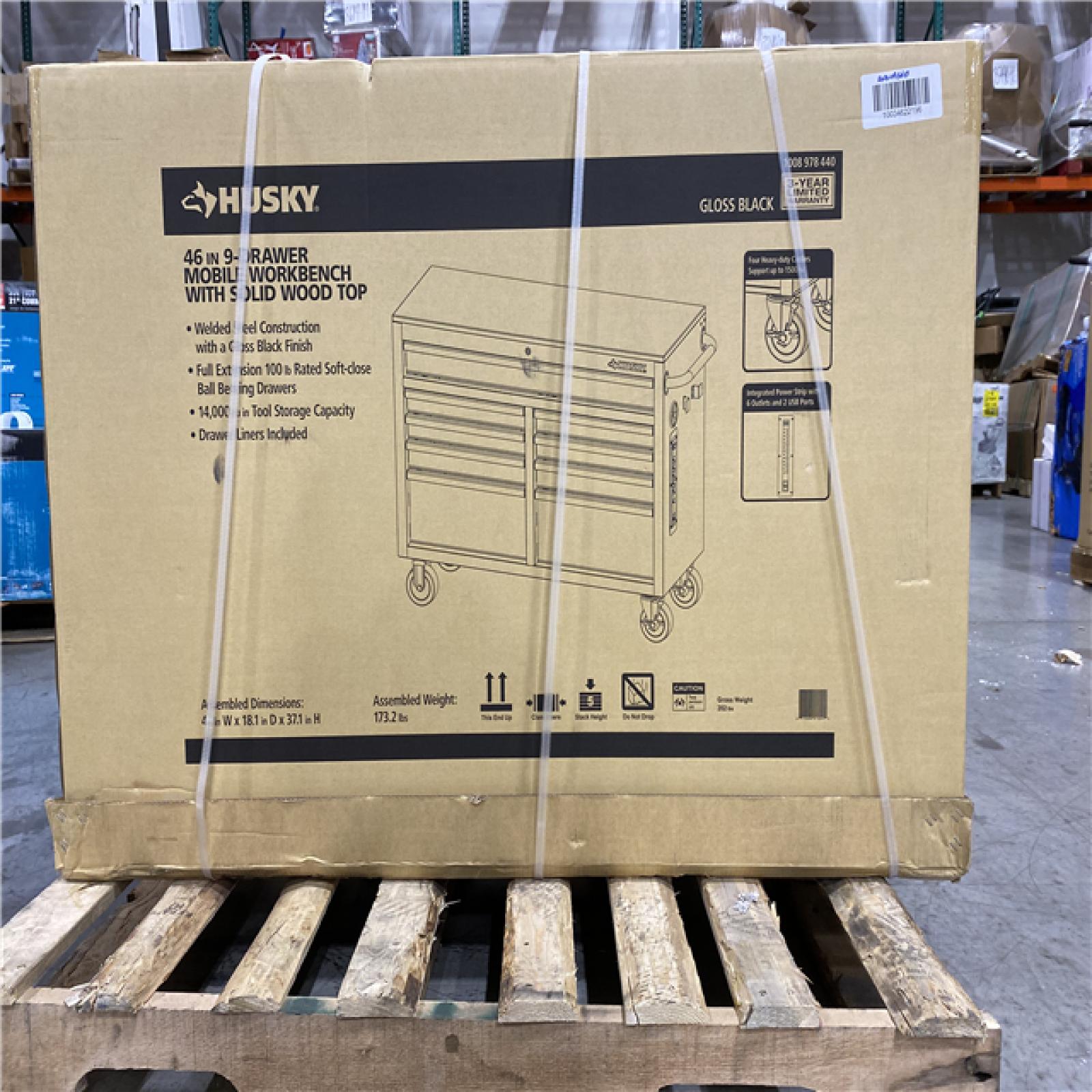 The all new Husky Extra-Deep 46 in. 9-Drawer Mobile Work Bench has arrived. This bundle includes the 46 in. Power Station with bins in order to provide additional storage and power supply. This work bench is 24.5 in. D, which creates 36% more storage capacity than traditional 18 in. D units. The extra-depth also means there is a much larger solid wood top to use as a work surface for all your projects. An integrated power strip on the side of the work bench provides easy access to power outlets and 2 USB Ports, so your tools and other electronic devices can always be charged up and ready to go. There is plenty of storage options within the work bench inside the 9 lockable 21.7 in. D drawers. Each drawer glides easily on 100 lbs. rated ball-bearing drawer slides and the large bottom drawers have an extra-set of slides to accommodate heavier items up to 200 lbs. Each drawer also has a premium pre-cut drawer liner that will protect both your tools and drawers. Finally, the entire work bench can easily move around your work space with four 5 in. x 2 in. casters and large ergonomic push handle.